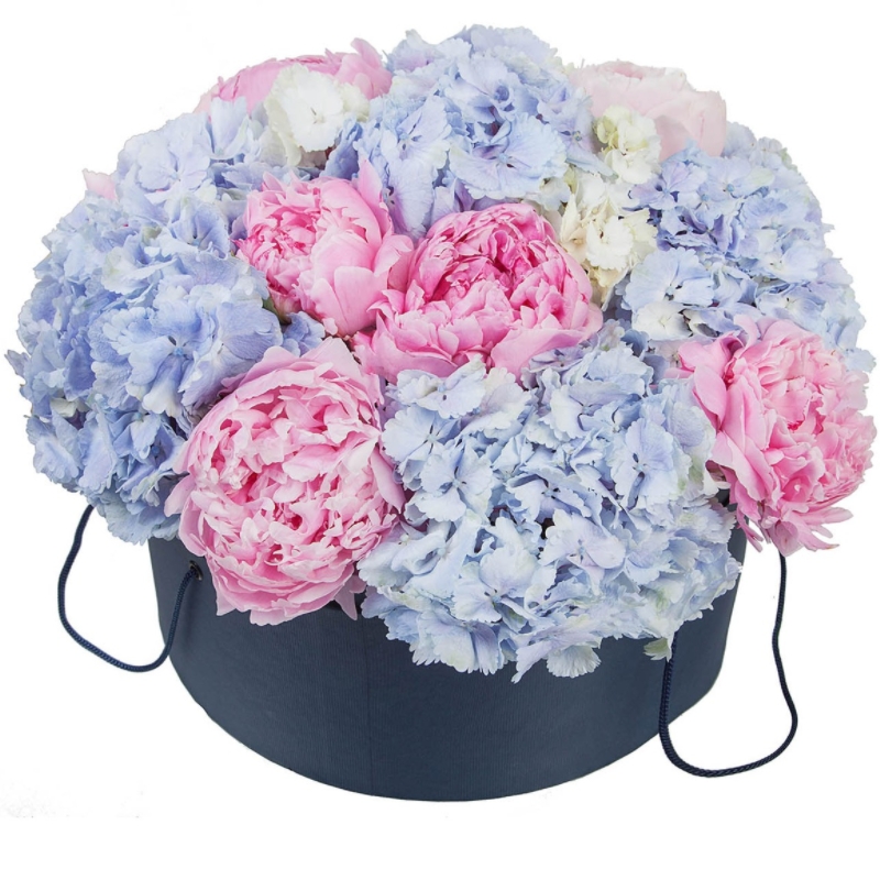 Букет состоит из 7 пионов, 6 гортензий, коробка, оазис.