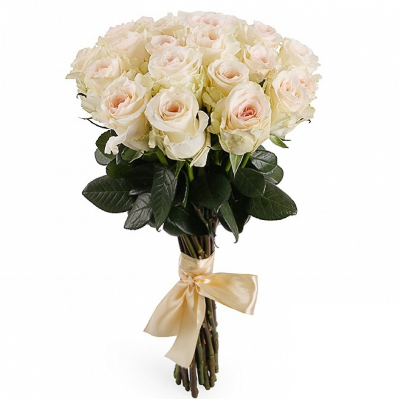 Букет состоит из 21 кремовая роза, прозрачная упаковка, атласная лента.
